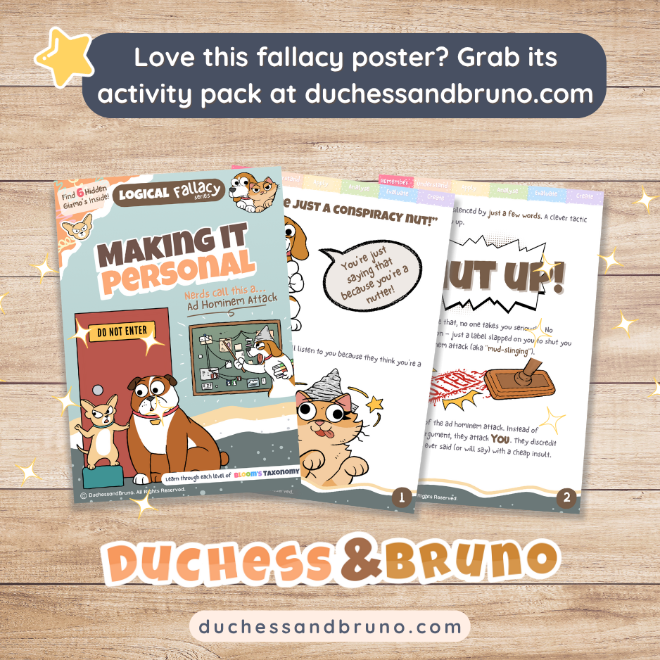 This vibrant A3 poster, printed on high-quality 250gsm matte paper at 300dpi, makes spotting this fallacy fun and clear — perfect for classroom walls, homeschool spaces, or kids’ rooms.