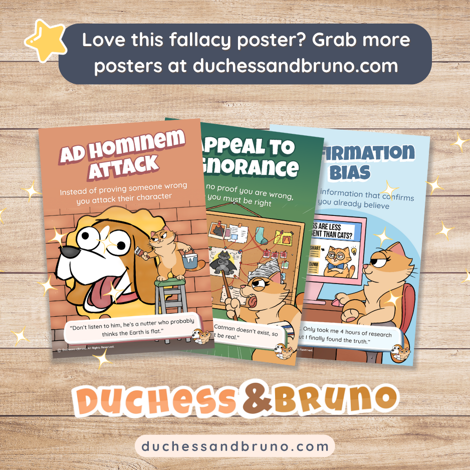 This vibrant A3 poster, printed on high-quality 250gsm matte paper at 300dpi, makes spotting this fallacy fun and clear — perfect for classroom walls, homeschool spaces, or kids’ rooms.