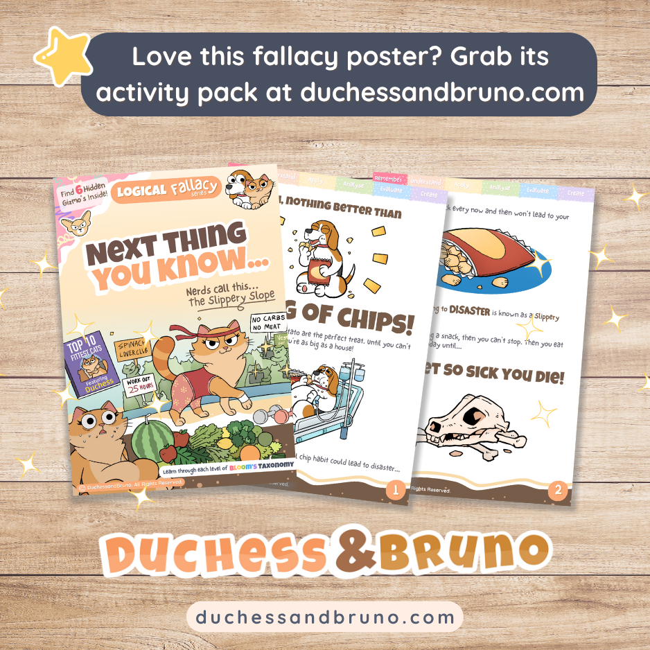 This vibrant A3 poster, printed on high-quality 250gsm matte paper at 300dpi, makes spotting this fallacy fun and clear — perfect for classroom walls, homeschool spaces, or kids’ rooms.