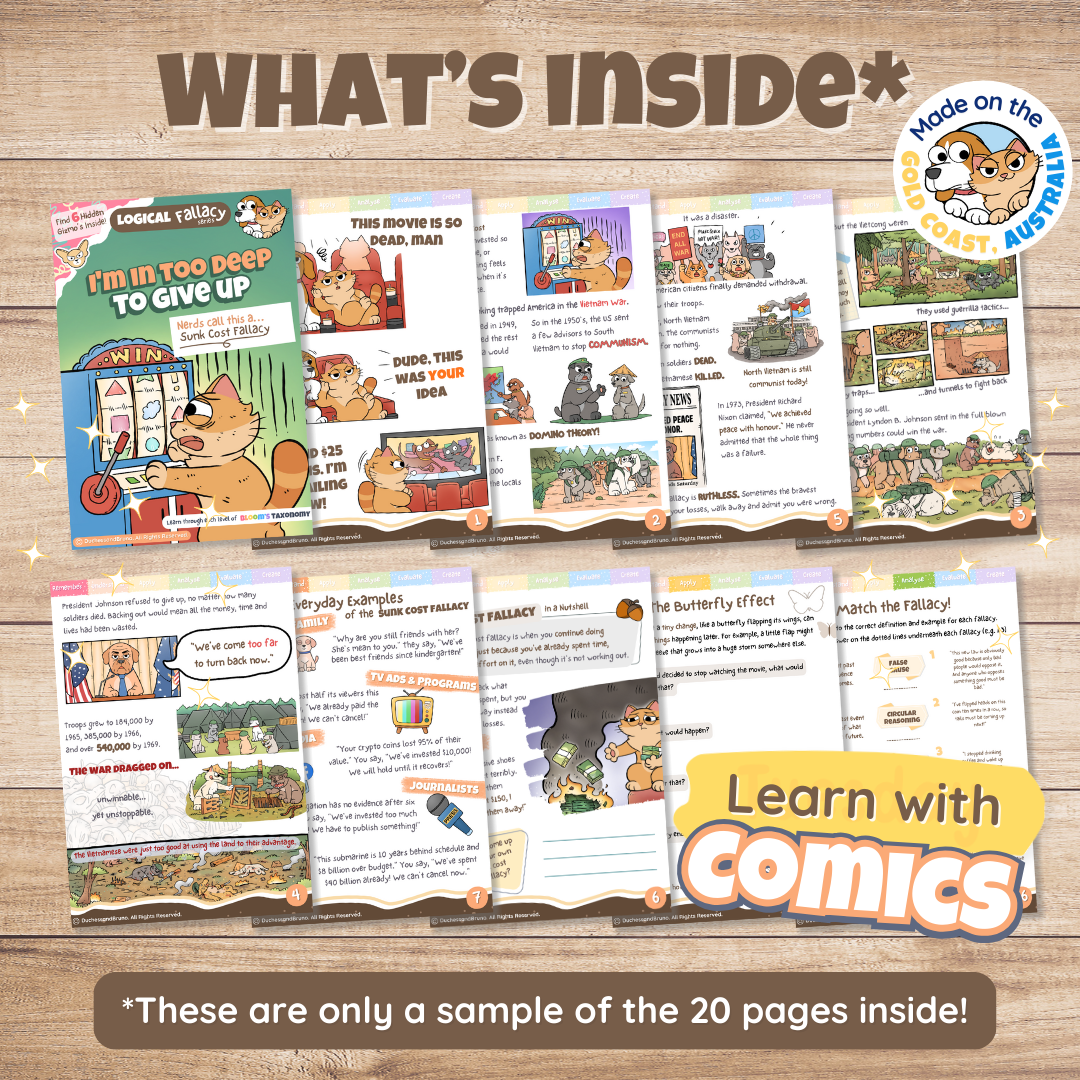 Our 20-page Sunk Cost Logical Fallacy Pack helps you think critically, unravel sneaky ideas, and make bold, smart choices. It’s learning that feels like an adventure!